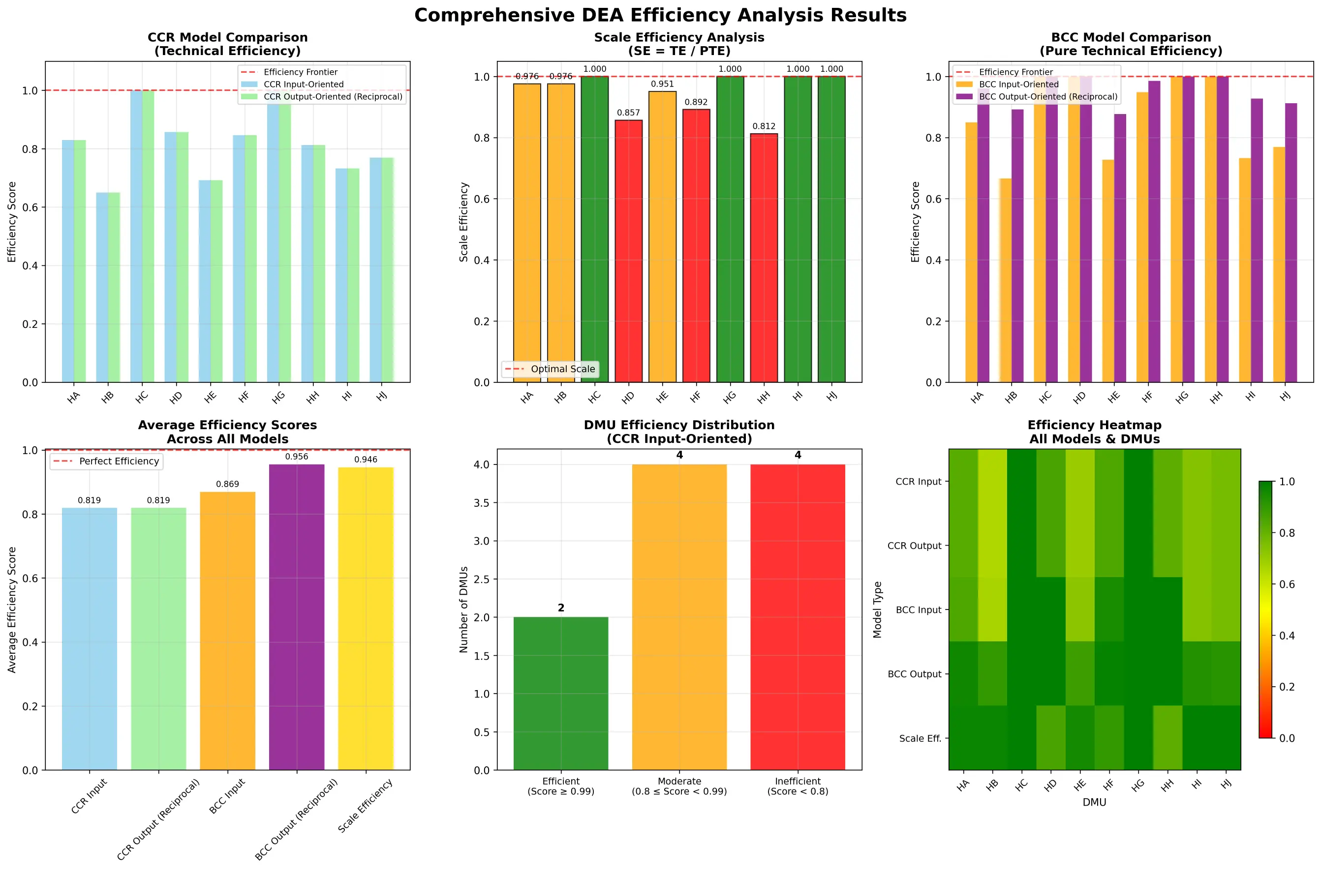 1 2 3 4 5 6 7 8 9 10 11 12 13 14 15 16 17 18 19 20 21 22 23 24 25 26 27 28 29 30 31 32 33 34 35 36 37 38 39 40 41 42 43 44 45 46 47 48 49 50 51 52 53 54 55 56 57 58 59 60 61 62 63 64 65 66 67 68 69 70 71 72 73 74 75 76 77 78 79 80 81 82 83 84 85 86 87 88 89 90 91 92 93 94 95 96 97 98 99 100 101 102 103 104 105 106 107 108 109 110 111 112 113 114 115 116 117 118 119 120 121 122 123 124 125 126 127 128 129 130 131 132 133 134 135 136 137 138 139 140 141 142 143 144 145 146 147 148 149 150 151 152 153 154 155 156 157 158 159 160 161 162 163 164 165 166 167 168 169 170 171 172 173 174 175 176 177 178 179 180 181 182 183 184 185 186 187 188 189 190 191 192 193 194 195 196 197 198 199 200 201 202 203 204 205 206 207 208 209 210 211 212 213 214 215 216 217 218 219 220 221 222 223 224 225 226 227 228 229 230 231 232 233 234 235 236 237 238 239 240 241 242 243 244 245 246 247 248 249 250 251 252 253 254 255 256 257 258 259 260 261 262 263 264 265 266 267 268 269 270 271 272 273 274 275 276 277 278 279 280 281 282 283 284 285 286 287 288 289 290 291 292 293 294 295 296 297 298 299 300 301 302 303 304 305 306 307 308 309 310 311 312 313 ================================================================================ DEA综合分析系统 ================================================================================ 数据加载成功:- 2023年数据:10 个医院- 2024年数据:10 个医院- 输入指标:医生数量、护士数量、床位数、运营成本- 输出指标:接诊患者数、收入、患者满意度 开始运行DEA分析... 1. 运行CCR模型分析... ================================================================================ CCR模型分析 (Constant Returns to Scale - CRS) ================================================================================ CCR模型特点:- 假设常数规模报酬(Constant Returns to Scale)- 所有DMU在相同的技术水平下运营- 效率得分反映了整体技术效率 【CCR模型 - 输入导向分析】 目标:在保持输出不变的情况下,最小化输入使用得分解释:0 < 得分 ≤ 1,得分 = 1表示效率前沿,得分 < 1表示可以减少输入 ---------------------------------------------------------------------- Hospital A: 0.8293 (可减少投入 17.07%) Hospital B: 0.6504 (可减少投入 34.96%) Hospital C: 1.0000 (效率前沿) Hospital D: 0.8571 (可减少投入 14.29%) Hospital E: 0.6918 (可减少投入 30.82%) Hospital F: 0.8462 (可减少投入 15.38%) Hospital G: 1.0000 (效率前沿) Hospital H: 0.8125 (可减少投入 18.75%) Hospital I: 0.7328 (可减少投入 26.72%) Hospital J: 0.7692 (可减少投入 23.08%) 【CCR模型 - 输出导向分析】 目标:在保持输入不变的情况下,最大化输出 得分解释:得分 ≥ 1,得分 = 1表示效率前沿,得分 > 1表示可以增加输出注意:输出导向得分越大,效率越低(与输入导向相反) ---------------------------------------------------------------------- Hospital A: 1.2059 (可增加产出 20.59%) Hospital B: 1.5375 (可增加产出 53.75%) Hospital C: 1.0000 (效率前沿) Hospital D: 1.1667 (可增加产出 16.67%) Hospital E: 1.4455 (可增加产出 44.55%) Hospital F: 1.1818 (可增加产出 18.18%) Hospital G: 1.0000 (效率前沿) Hospital H: 1.2308 (可增加产出 23.08%) Hospital I: 1.3647 (可增加产出 36.47%) Hospital J: 1.3000 (可增加产出 30.00%) 【CCR模型分析摘要】- 输入导向:平均效率得分 0.8189,2个DMU达到效率前沿- 输出导向:平均效率得分 1.2433,2个DMU达到效率前沿- 标准差:输入导向 0.1106,输出导向 0.1658 2. 运行BCC模型分析... ================================================================================ BCC模型分析 (Variable Returns to Scale - VRS) ================================================================================ BCC模型特点:- 假设可变规模报酬(Variable Returns to Scale)- 允许DMU在不同规模下运营- 测量纯技术效率(去除规模效应) 【BCC模型 - 输入导向分析】 目标:在保持输出不变的情况下,最小化输入使用得分解释:0 < 得分 ≤ 1,得分 = 1表示效率前沿,得分 < 1表示可以减少输入 ---------------------------------------------------------------------- Hospital A: 0.8500 (可减少投入 15.00%) Hospital B: 0.6667 (可减少投入 33.33%) Hospital C: 1.0000 (效率前沿) Hospital D: 1.0000 (效率前沿) Hospital E: 0.7273 (可减少投入 27.27%) Hospital F: 0.9487 (可减少投入 5.13%) Hospital G: 1.0000 (效率前沿) Hospital H: 1.0000 (效率前沿) Hospital I: 0.7328 (可减少投入 26.72%) Hospital J: 0.7692 (可减少投入 23.08%) 【BCC模型 - 输出导向分析】 目标:在保持输入不变的情况下,最大化输出 得分解释:得分 ≥ 1,得分 = 1表示效率前沿,得分 > 1表示可以增加输出注意:输出导向得分越大,效率越低(与输入导向相反) ---------------------------------------------------------------------- Hospital A: 1.0408 (效率前沿) Hospital B: 1.1206 (可增加产出 12.06%) Hospital C: 1.0000 (效率前沿) Hospital D: 1.0000 (效率前沿) Hospital E: 1.1403 (可增加产出 14.03%) Hospital F: 1.0144 (效率前沿) Hospital G: 1.0000 (效率前沿) Hospital H: 1.0000 (效率前沿) Hospital I: 1.0781 (可增加产出 7.81%) Hospital J: 1.0963 (可增加产出 9.63%) 【BCC模型分析摘要】- 输入导向:平均效率得分 0.8695,4个DMU达到效率前沿- 输出导向:平均效率得分 1.0491,6个DMU达到效率前沿- 标准差:输入导向 0.1284,输出导向 0.0524 3. 运行输出导向分析... ================================================================================ 输出导向DEA分析 (Output-Oriented DEA Analysis) ================================================================================ 🔍 输出/输入导向分析原理解释: ━━━━━━━━━━━━━━━━━━━━━━━━━━━━━━━━━━━━━━━━━━━━━━━━━━━━━